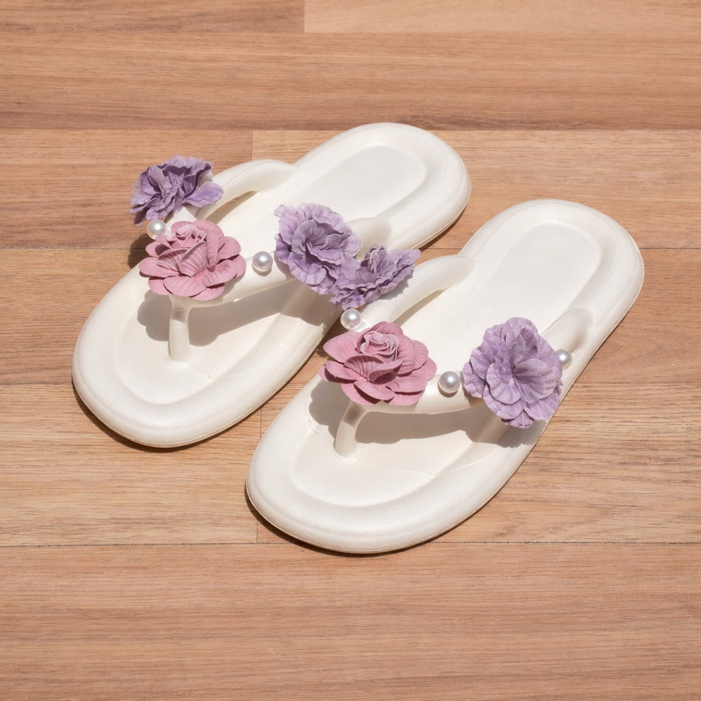 Step into style with our latest floral bubble flip flops, The Dynasty! Featuring a beautiful blend of multicolored florals and shimmering pearls, these flip flops are super cute and super comfortable. Available in black with stunning aqua florals and white with enchanting lilac florals. Perfect for any summer day or casual outing. Grab yours now and walk with elegance and ease! 💐
