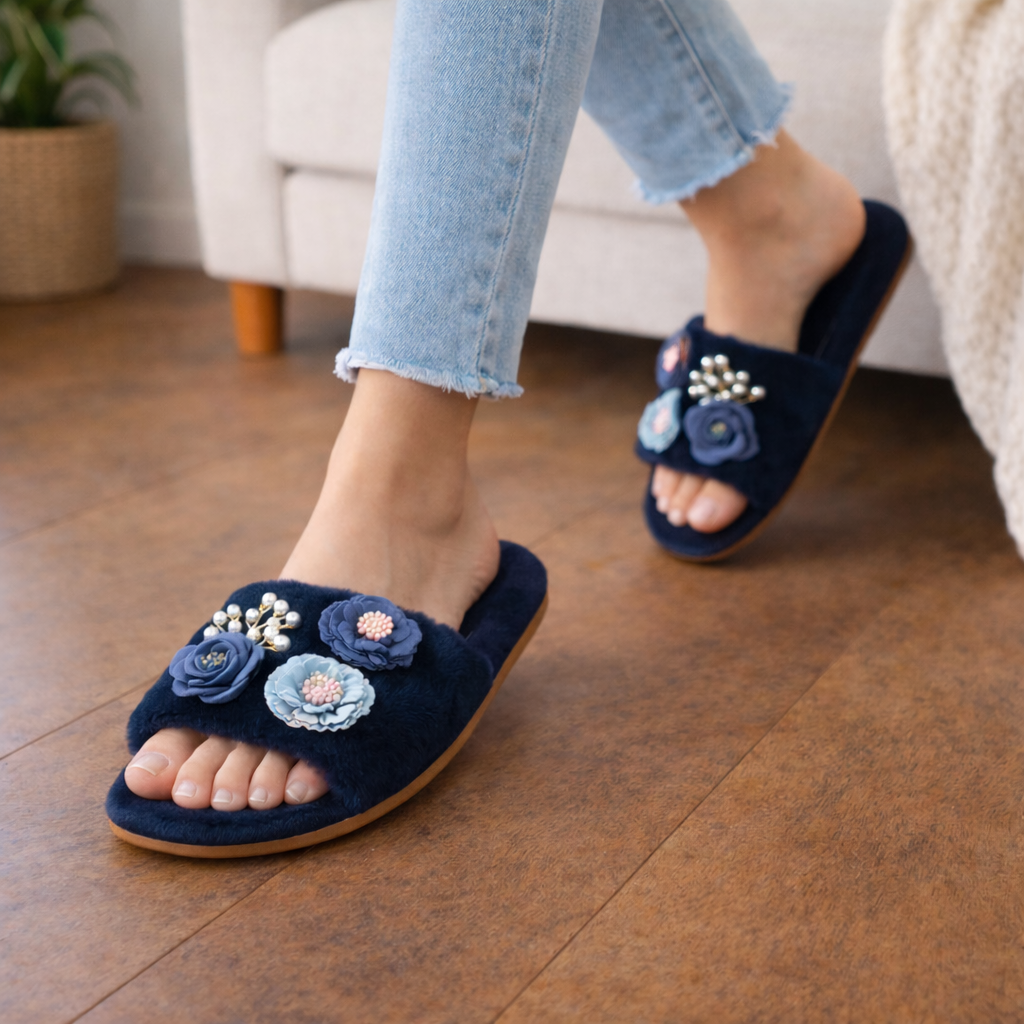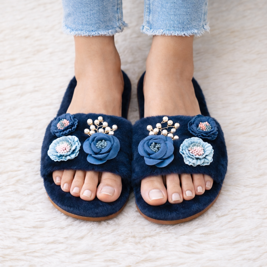 Step into softness that blooms with beauty. Each pair of The Opal Charm slippers is adorned with delicately layered floral appliqués and pearly accents — a whisper of romance with every step. Wrapped in velvety faux fur, they’re designed for moments of quiet luxury and effortless grace. Available in serene pastels and timeless neutrals, The Opal Charm is where comfort meets couture.