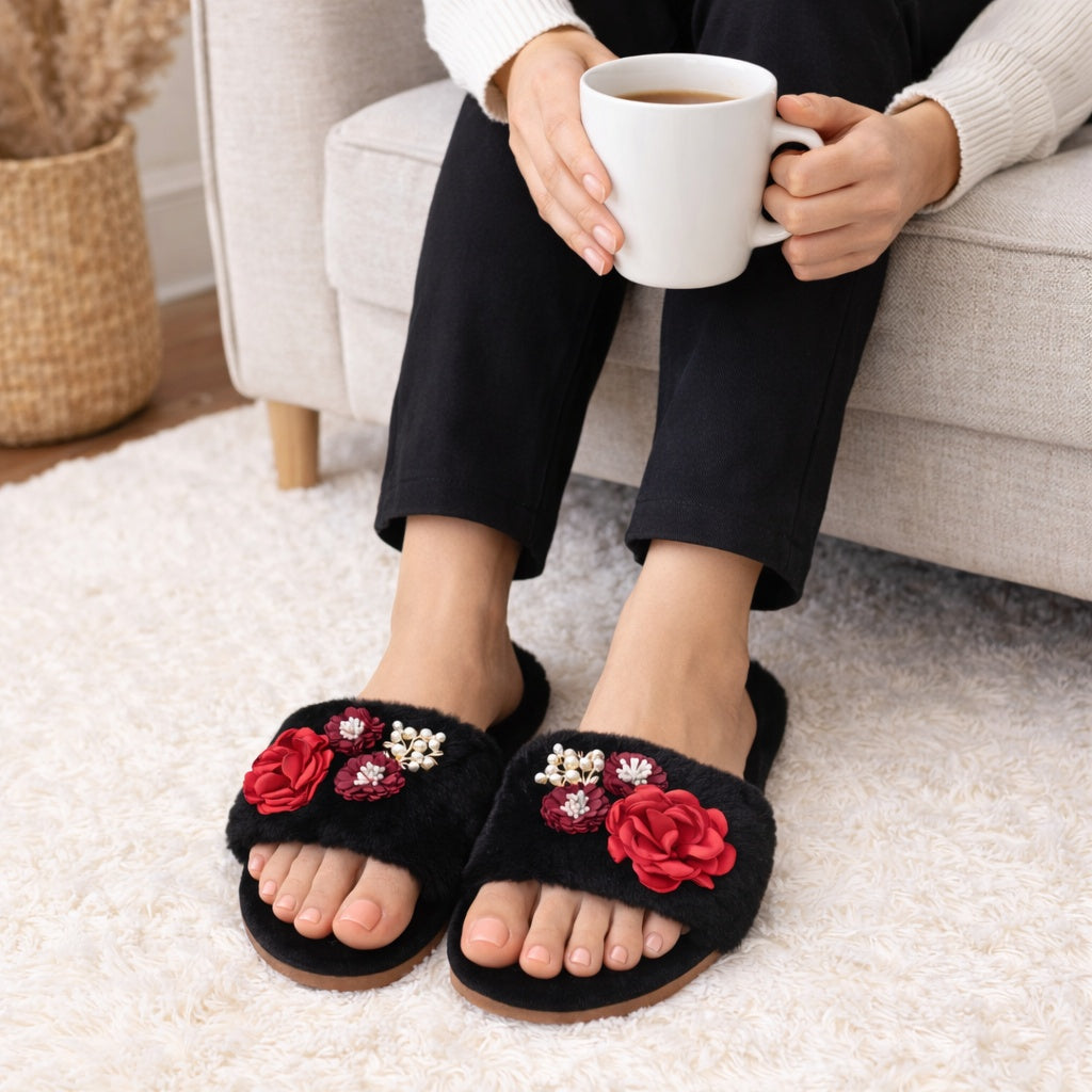 Introducing The Luxe Rosaria, where cozy comfort meets timeless glamour. Designed with plush fur, hand-placed florals, and shimmering embellishments, each pair feels like slipping into luxury. Available in a dreamy spectrum of black, grey, navy, and maroon, The Luxe Rosaria is perfect for elevating your everyday moments—from slow mornings to graceful evenings. Treat yourself to the softest statement piece of the season and step into effortless elegance today!