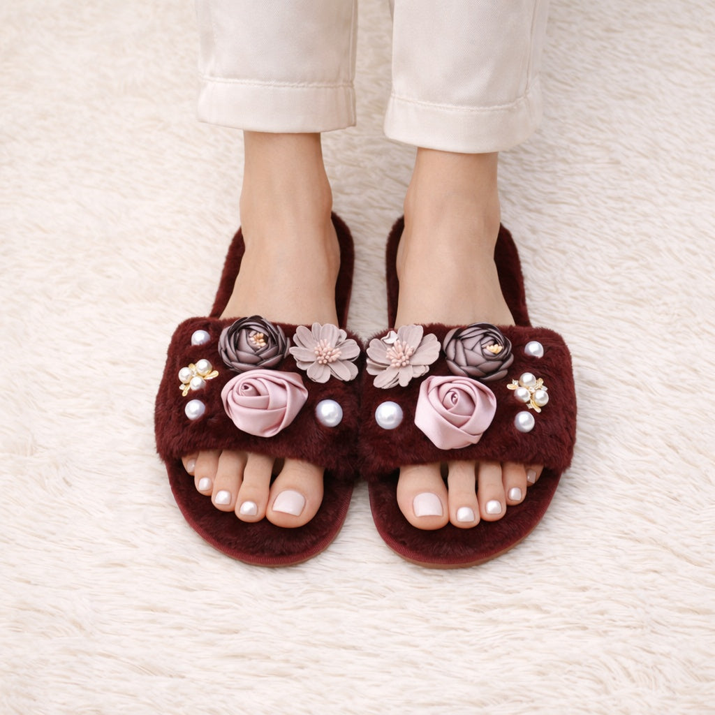 Meet The Sephora Stunner Collection — where timeless elegance meets indulgent comfort. Designed for those who know that true luxury never lingers, each handcrafted pair features plush faux fur in deep wine and midnight black, embellished with delicate florals and luminous pearls. Soft, statement-making, and exquisitely rare — because some beauties are made to be treasured, not restocked.
